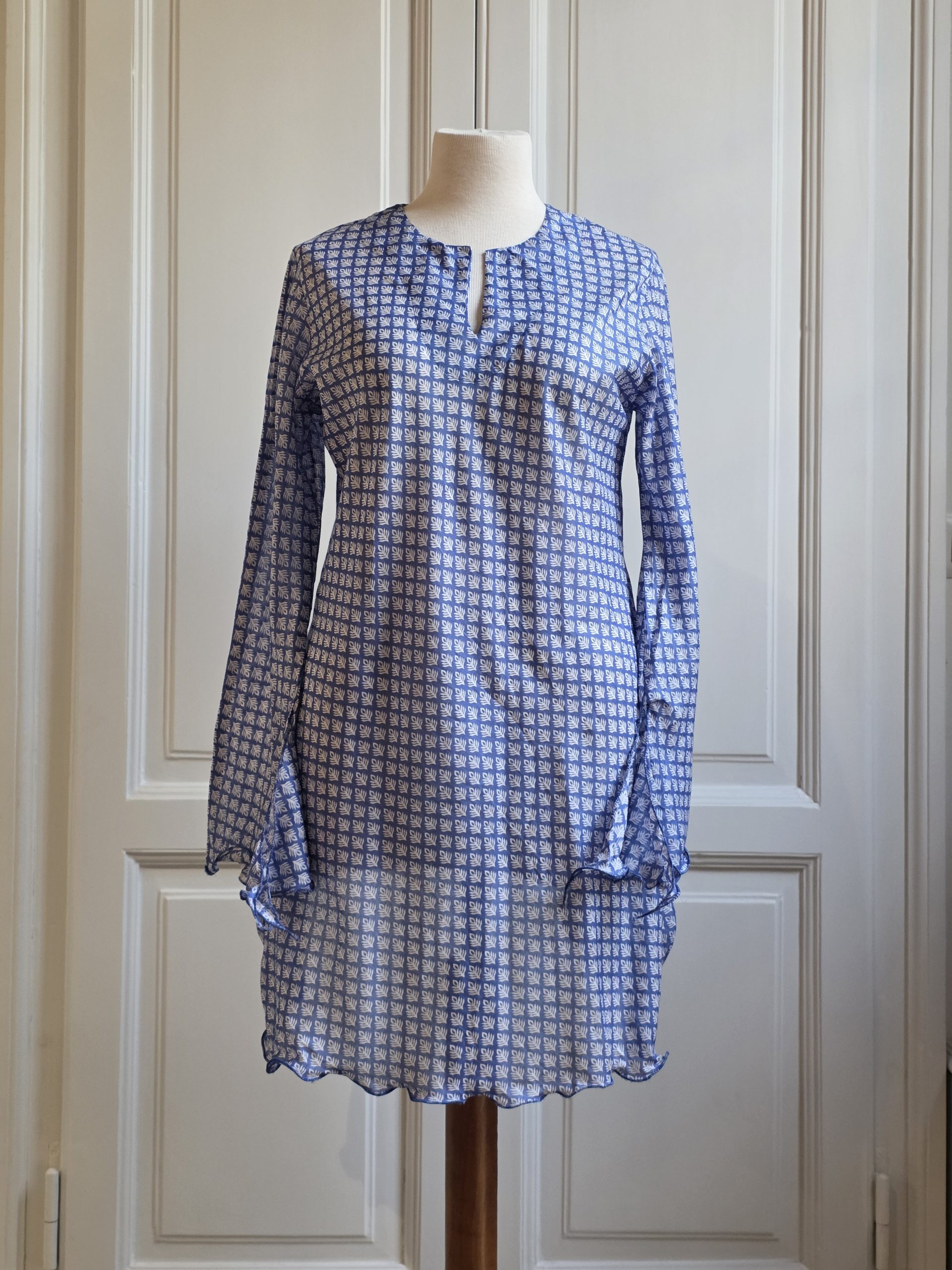 Il dettaglio di questo Caftano sono le maniche lunghe che finiscono in un largo volant tagliato sul polso. Lo stesso motivo è presente sull’orlo del caftano.