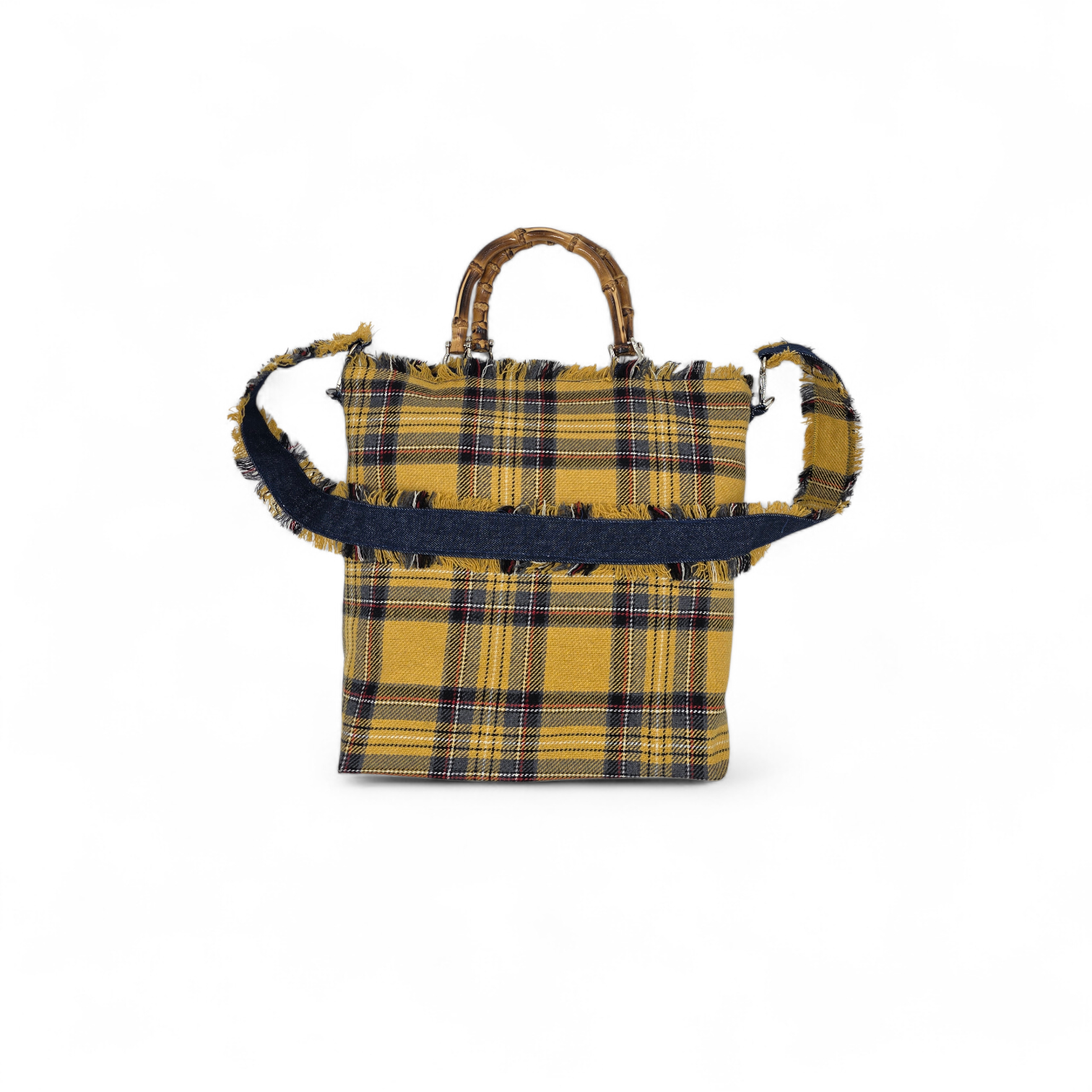 Realizzata a mano con tessuto scozzese, sfrangiato sul bordo, è la pratica borsa che userai tutti i giorni in città!