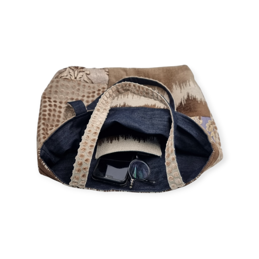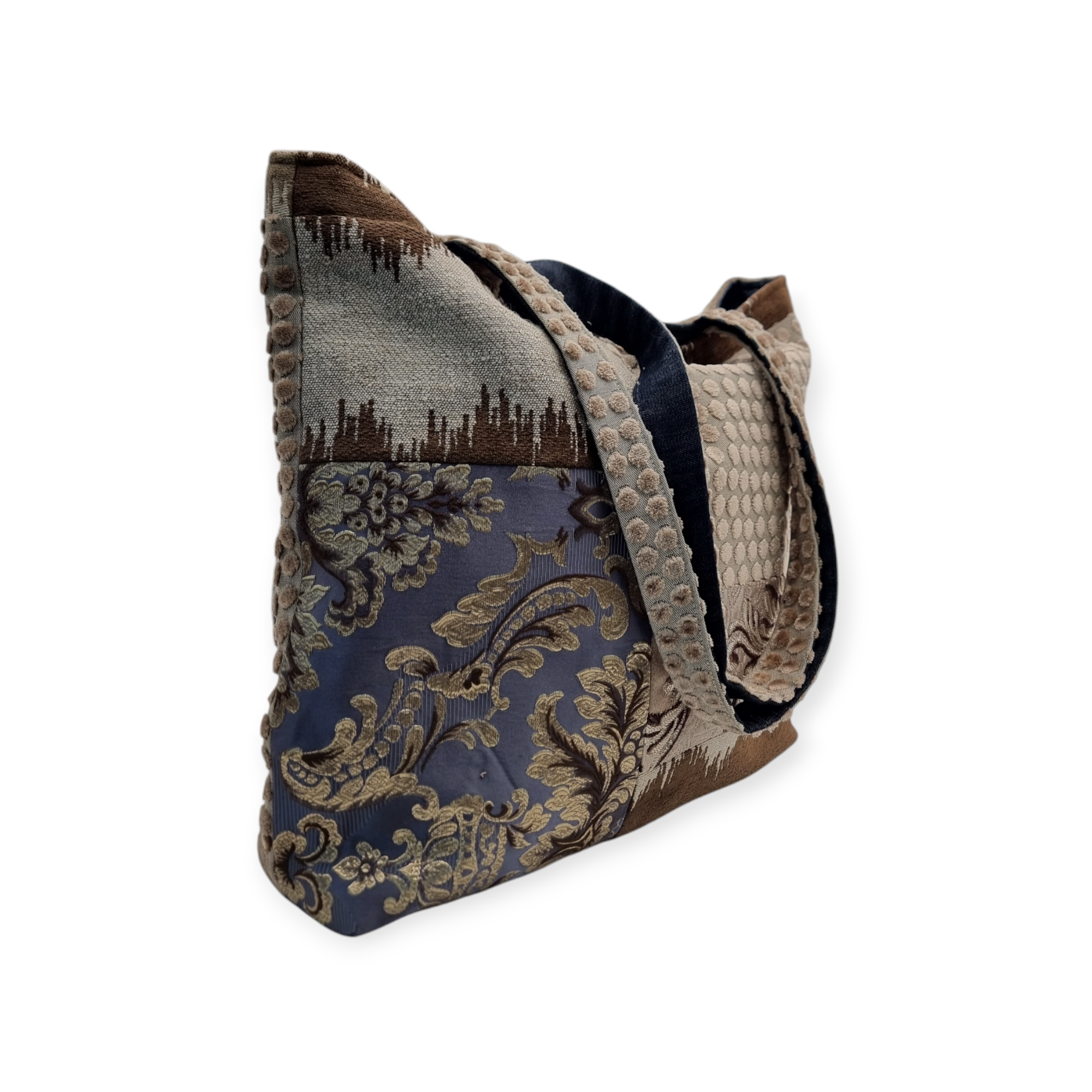 Borsa capiente, realizzata a mano con tessuti unici, foderata e con tasca all’interno.  Perfetta per un uso quotidiano e ideale anche come porta documenti e computer.