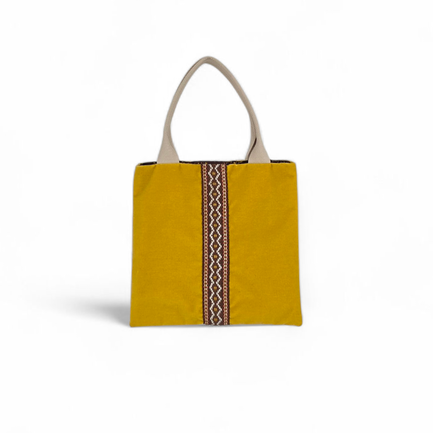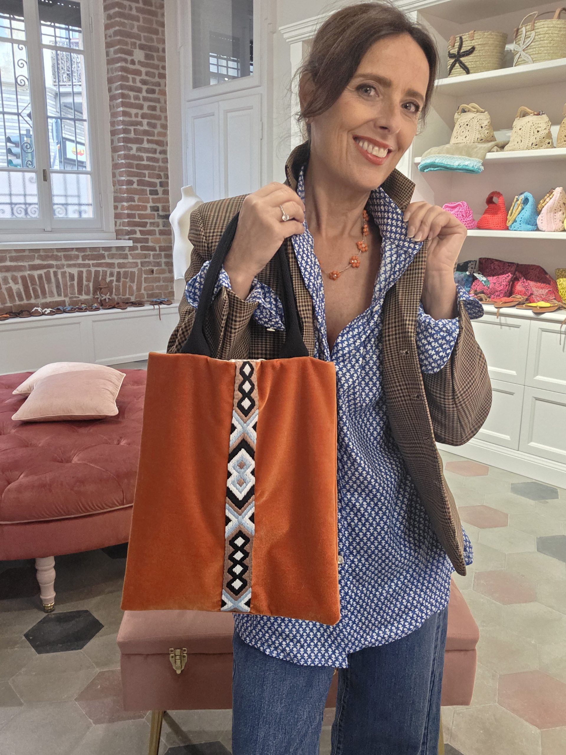La Maya è l’allegra borsa in velluto con passamaneria etnica, foderata in cotone a fantasia.