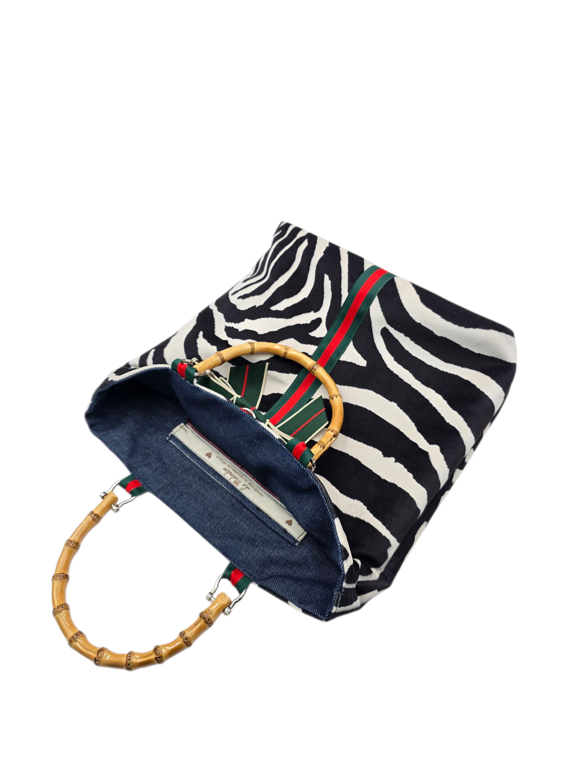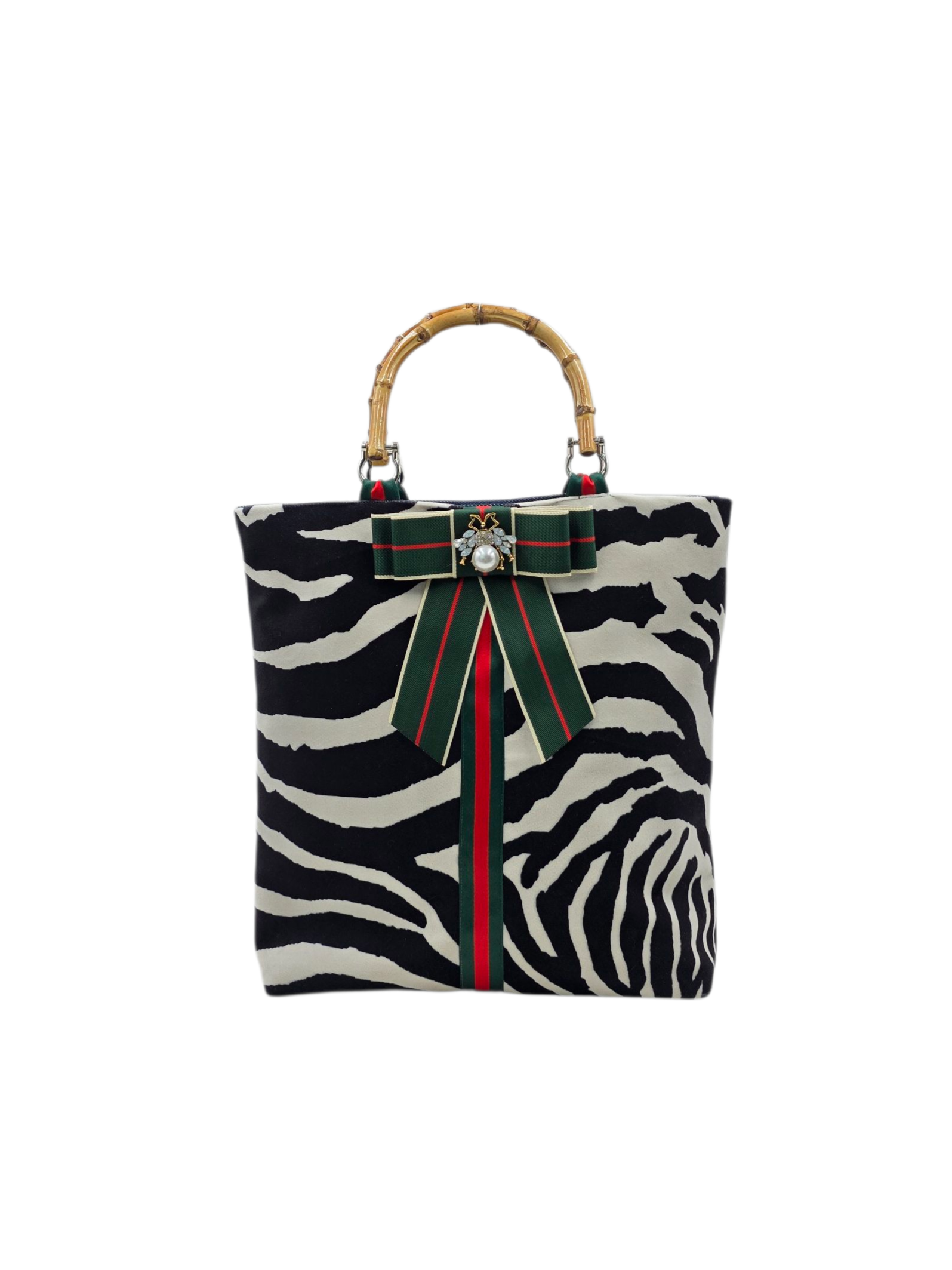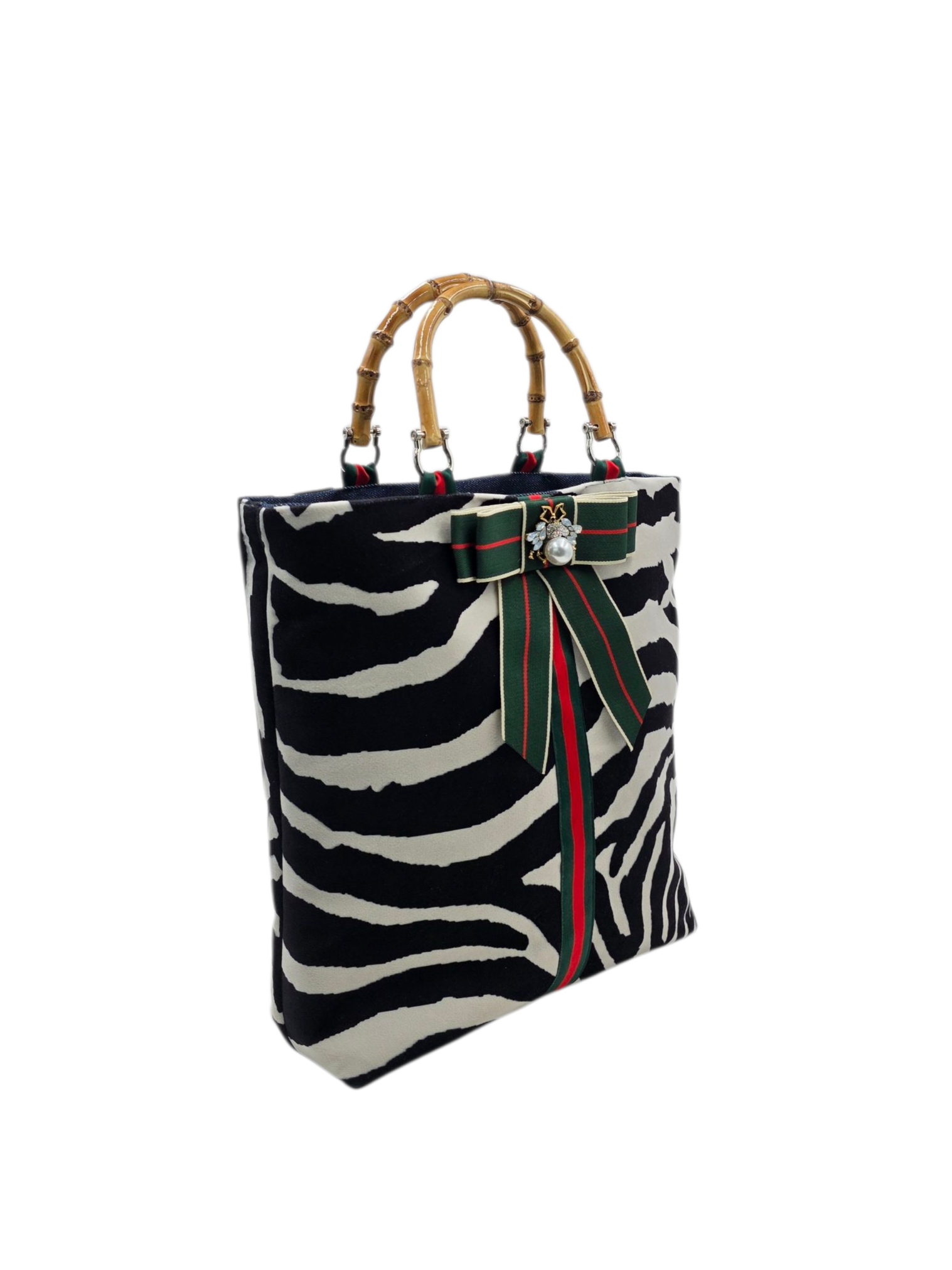 La Zoè è la shopper bag che puoi usare tutto il giorno. Realizzata in tessuto animalier, è completamente foderata in jeans e decorata con nastro grosgrain rosso e verde e spilla con ape.