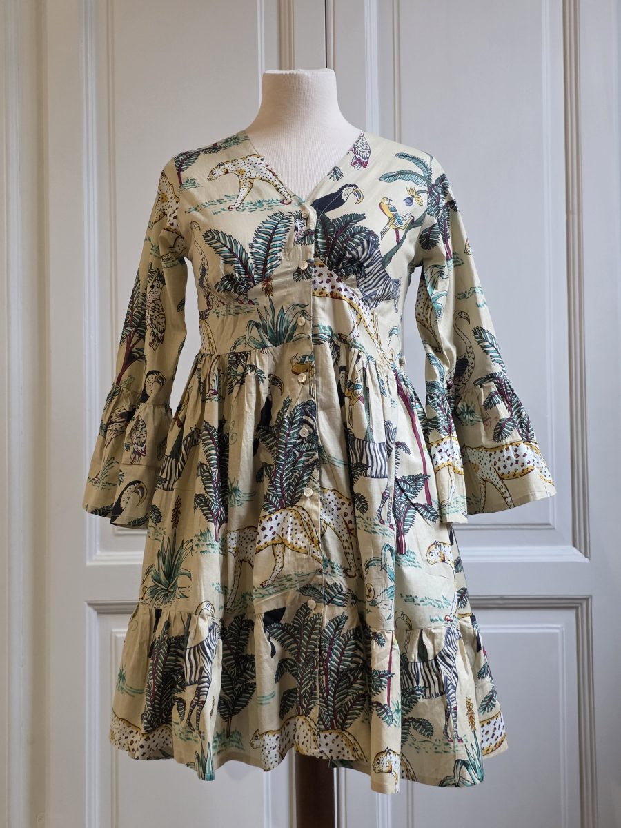 Il Savane dress è l’abitino in cotone organico con gli animali della savana stampati a mano.
