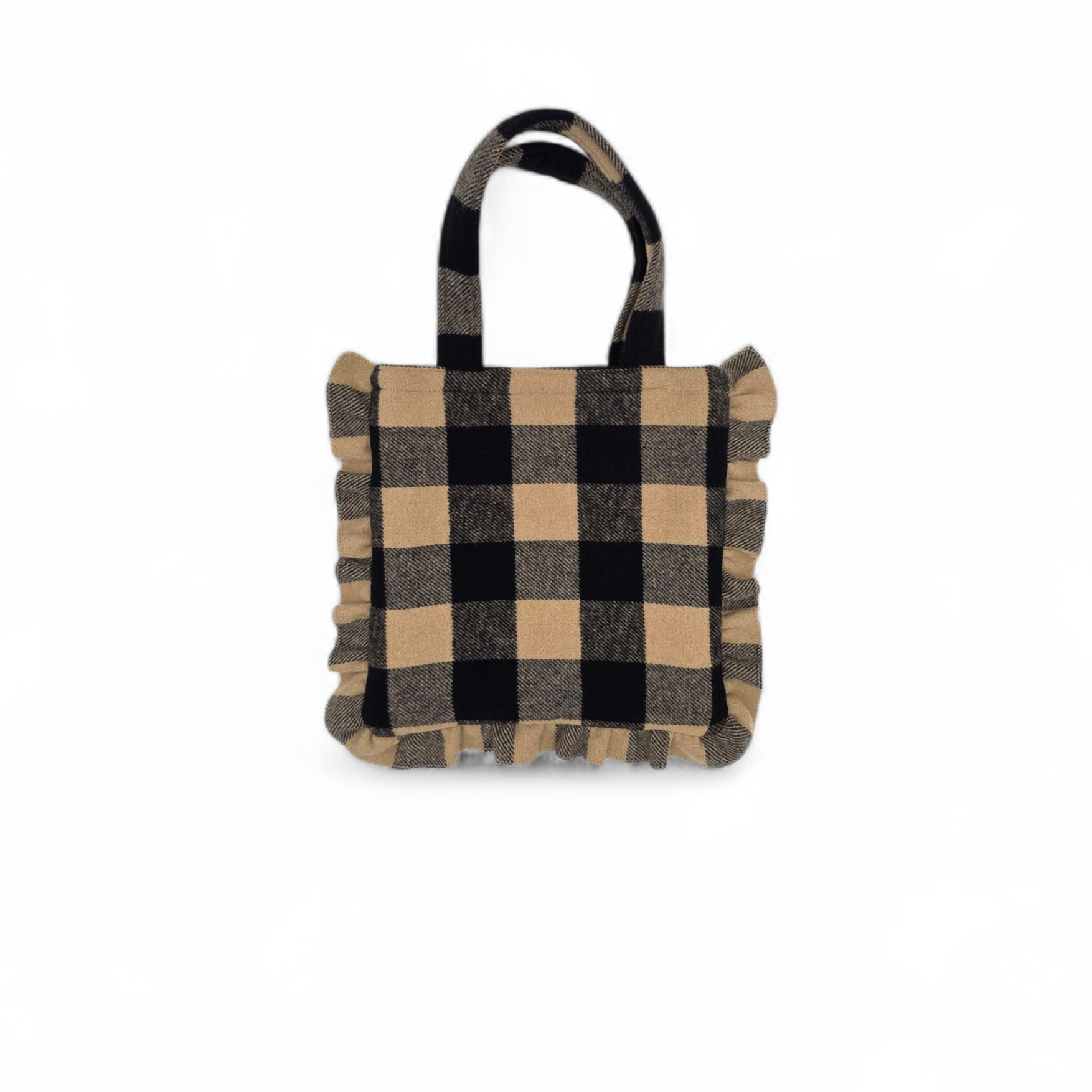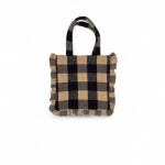 La Volantina è realizzata con stoffa di lana check a quadri grandi beige e nero. Ha lunghi manici che consentono di portarla a spalla, ideale anche per ufficio.