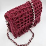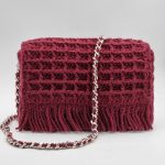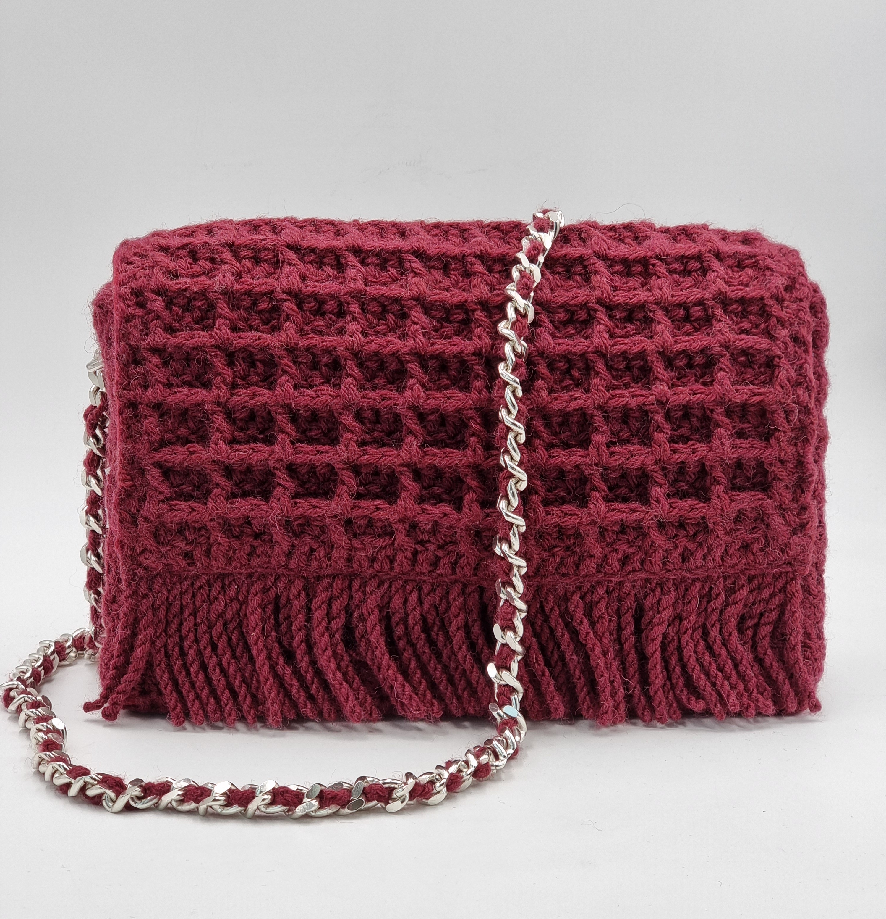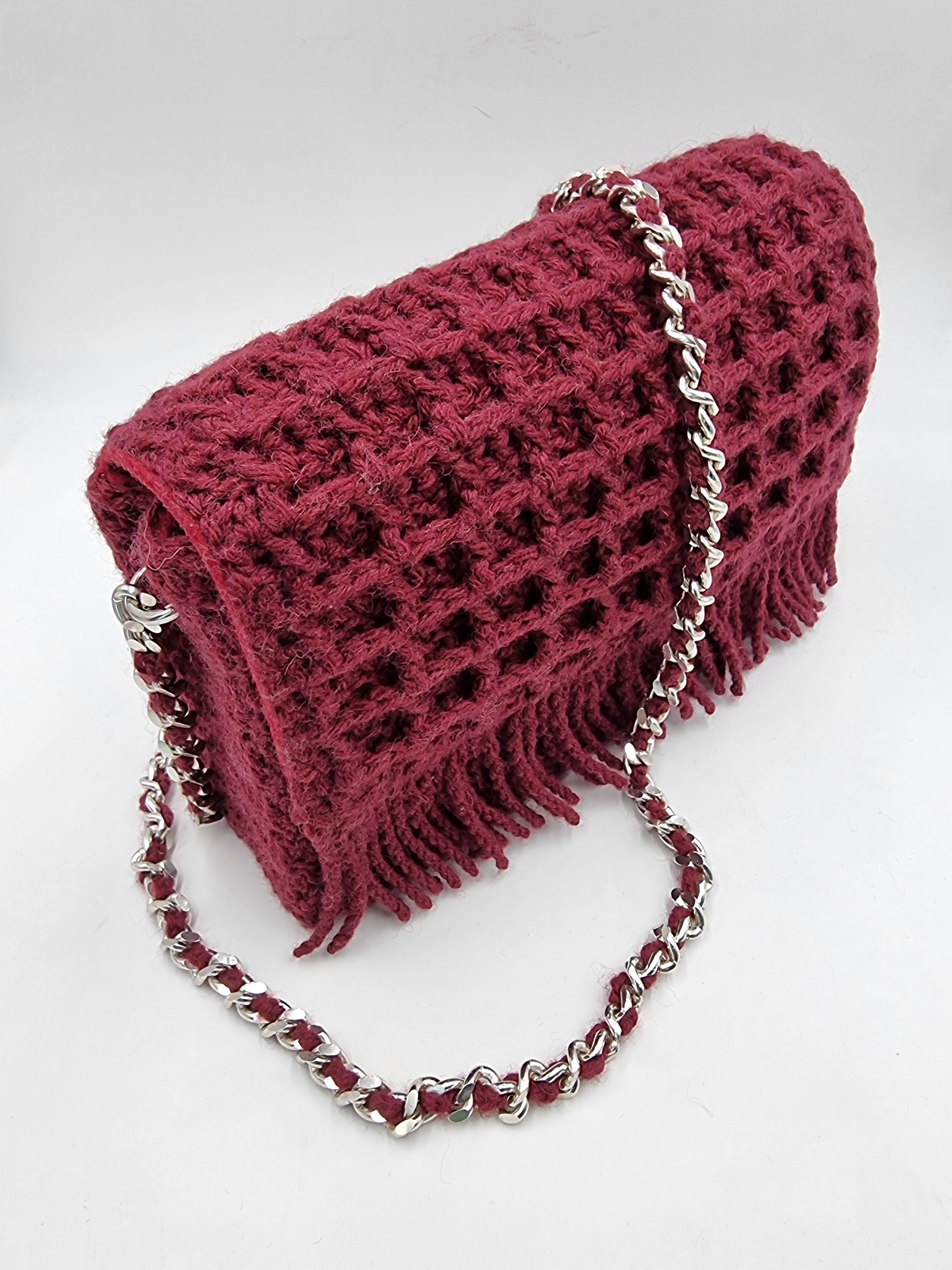 La borsa è in lana, realizzata interamente a mano all’uncinetto. L’interno è in feltro (dello stesso colore) per renderla rigida. Le dimensioni sono: 28 x 19 x 8 cm. La tracolla è una catena Chanel.